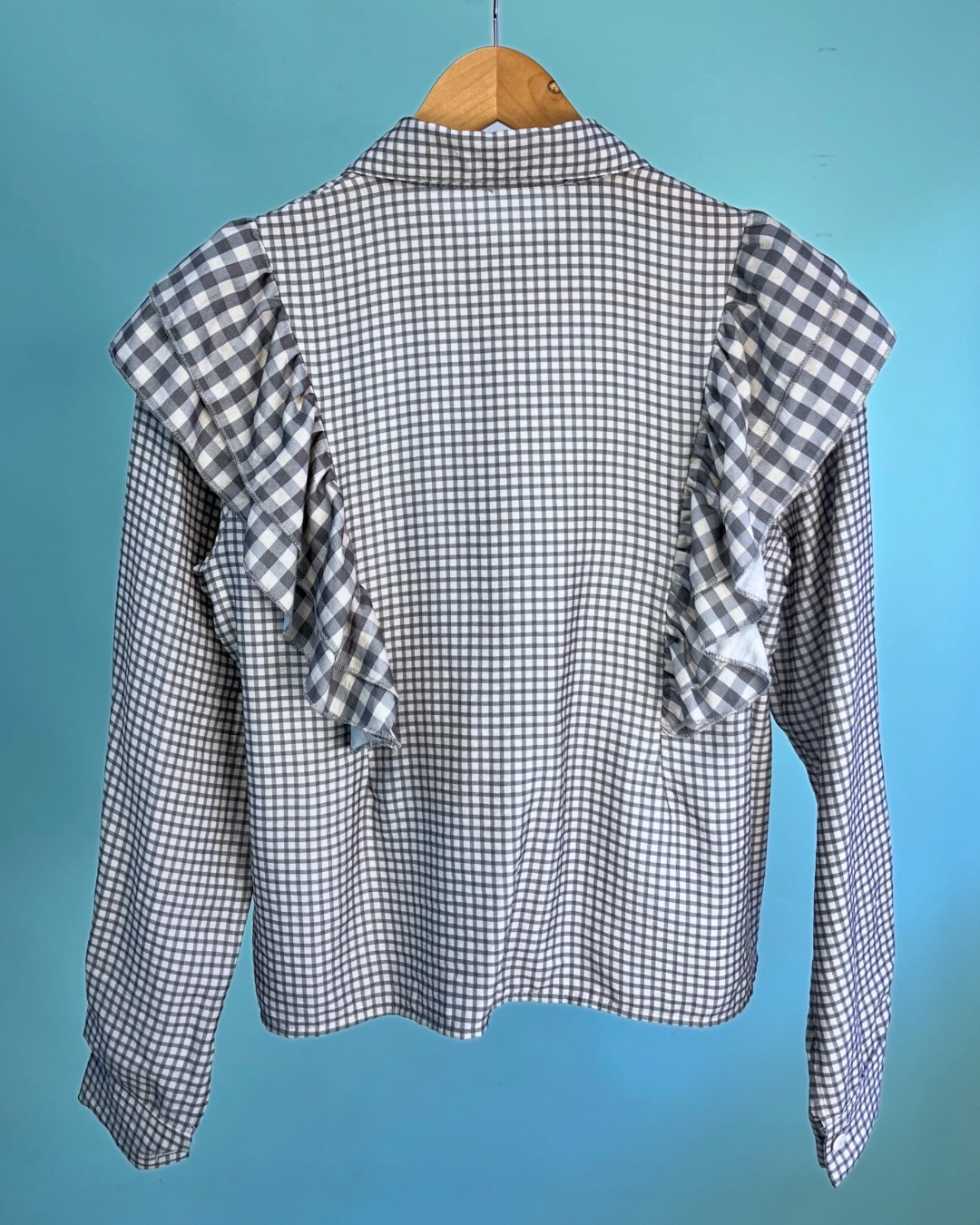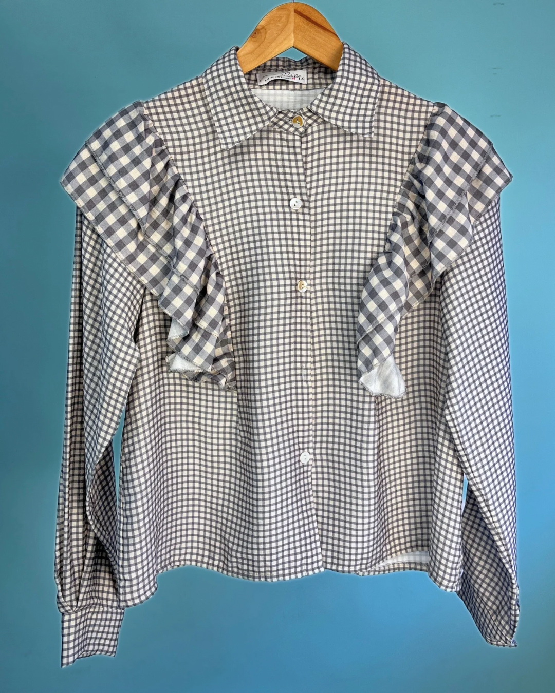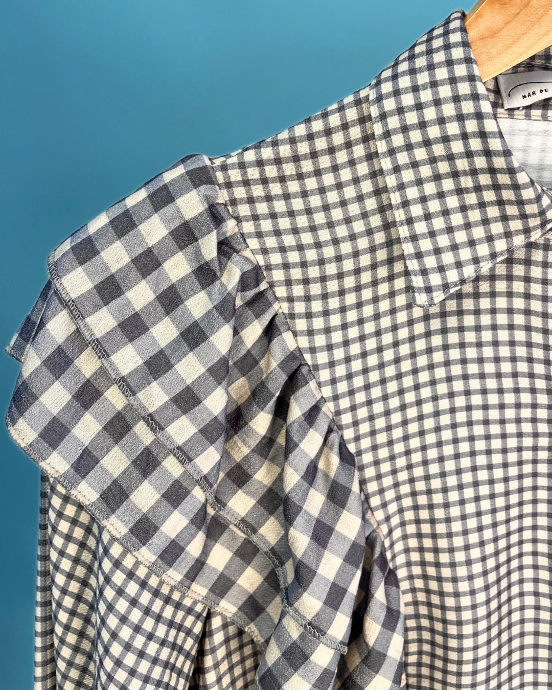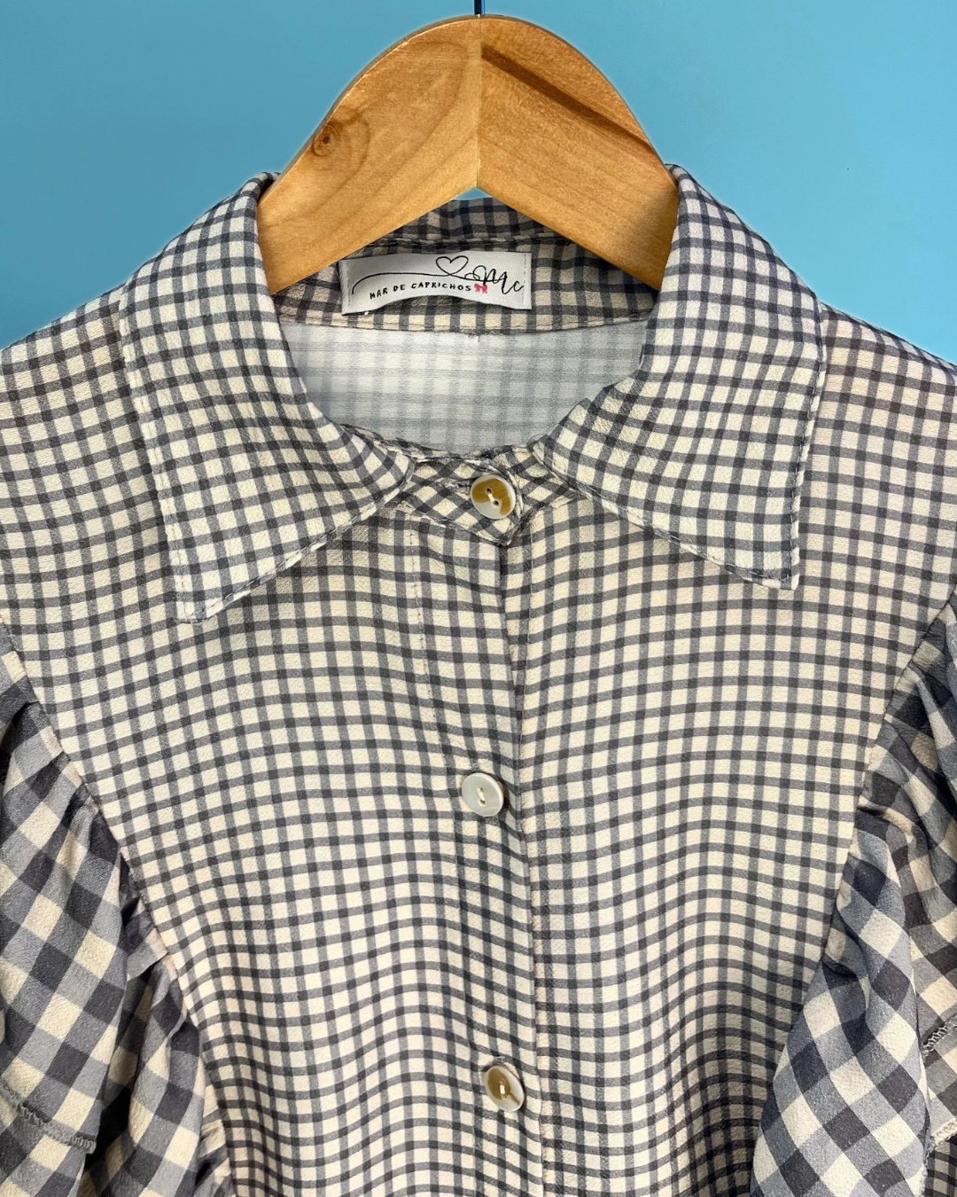 Camisa con flecos de media caída en hombro, con detalles en vichy en diferentes medidas y lazo a juego en cuadro vichy del mismo color, ideal para elevar tu look y hacerlo algo más especial y único. El lazo le proporciona mucha versatilidad a esta camisa, ya que lo puedes estilizar de diferentes formas.