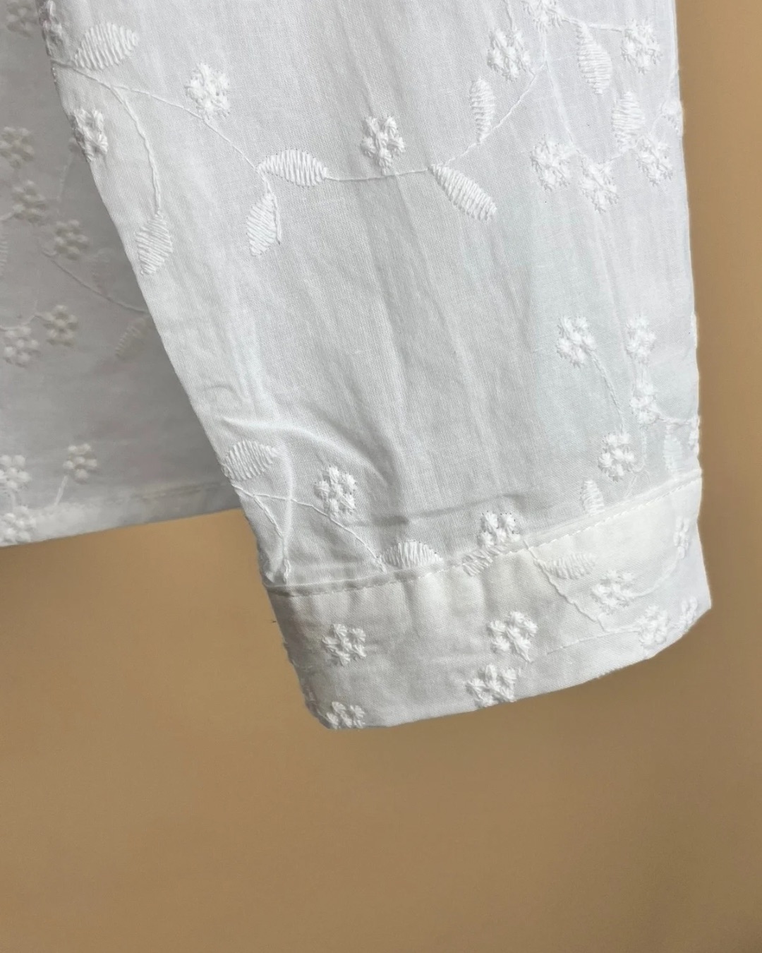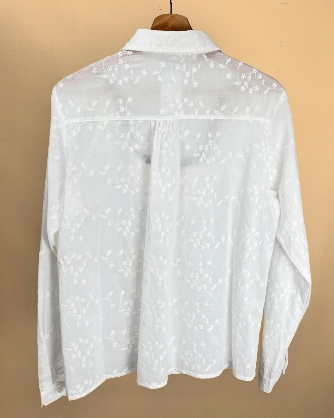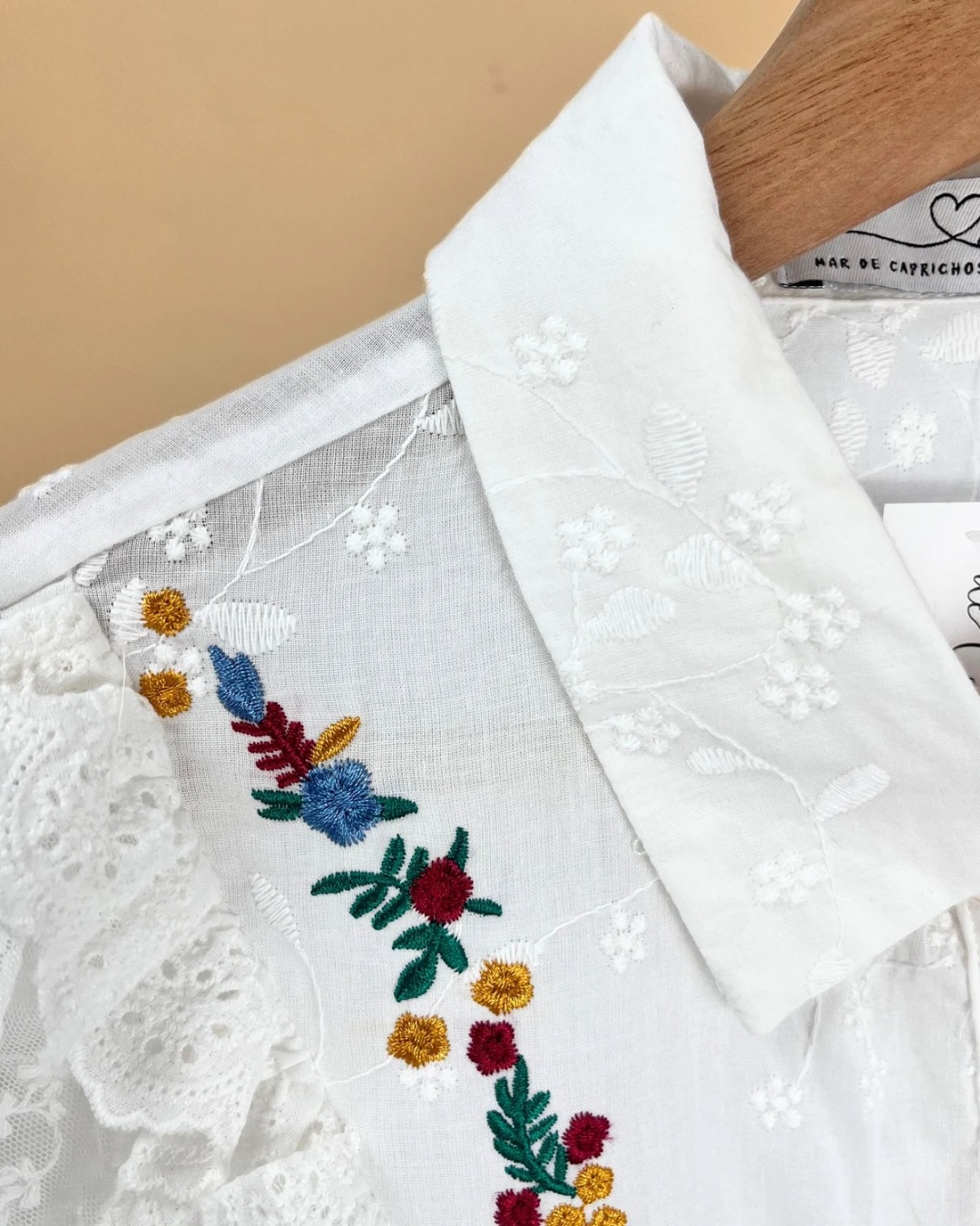 Camisa blanca con bordados florales en diferentes colores en el pecho. La forma en pico superpuesta combinado con el encaje del volante eleva tu look, y lo hace especial.