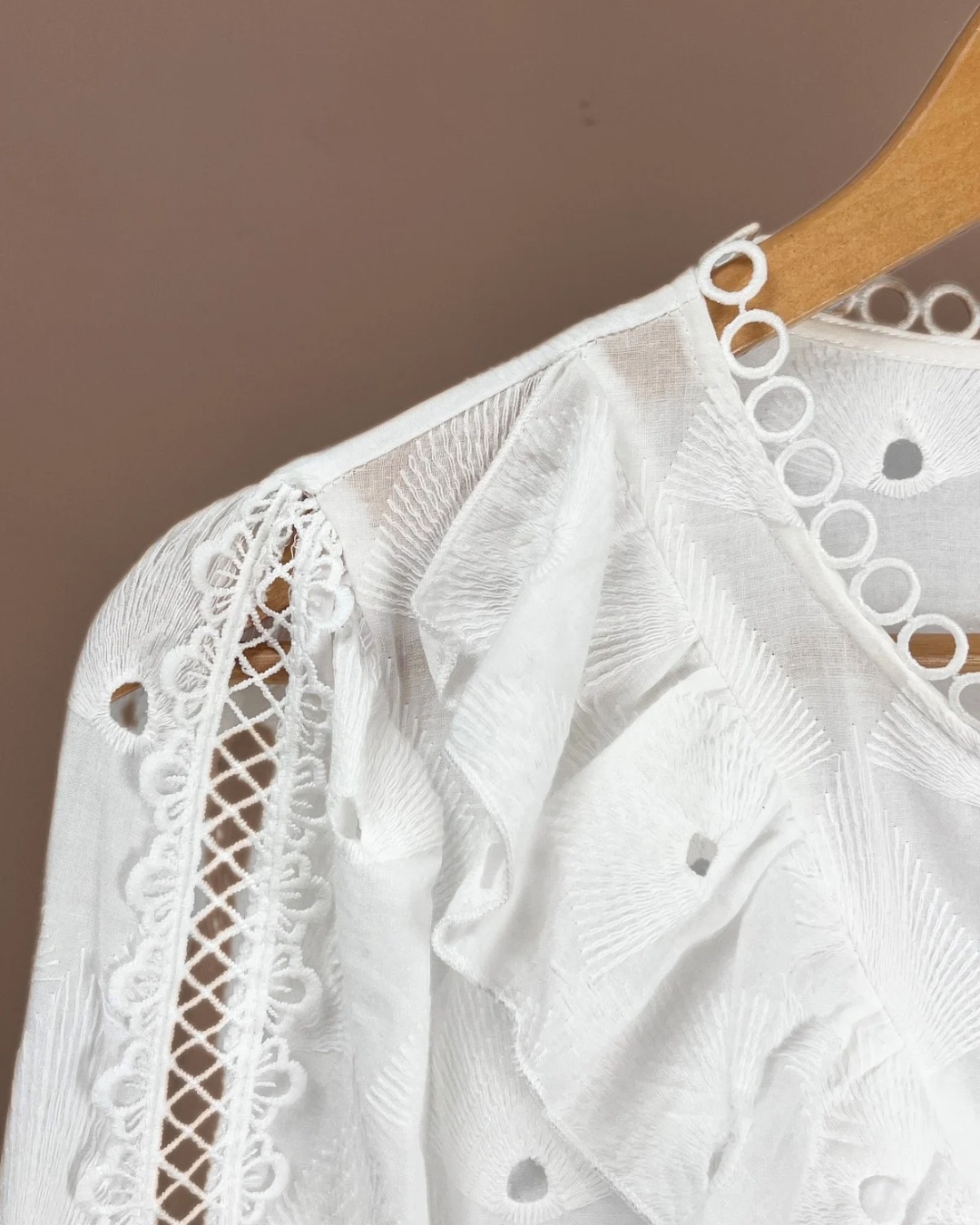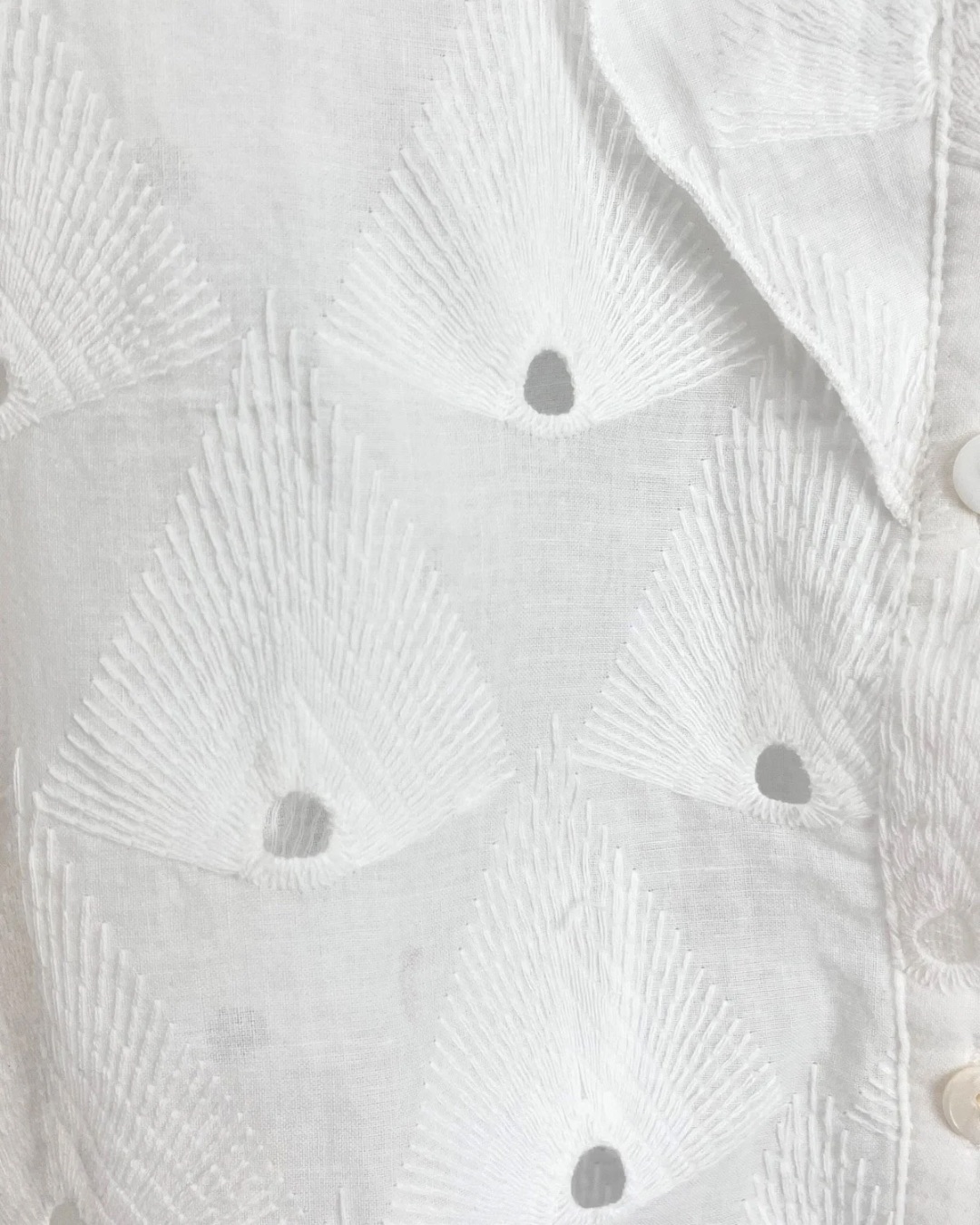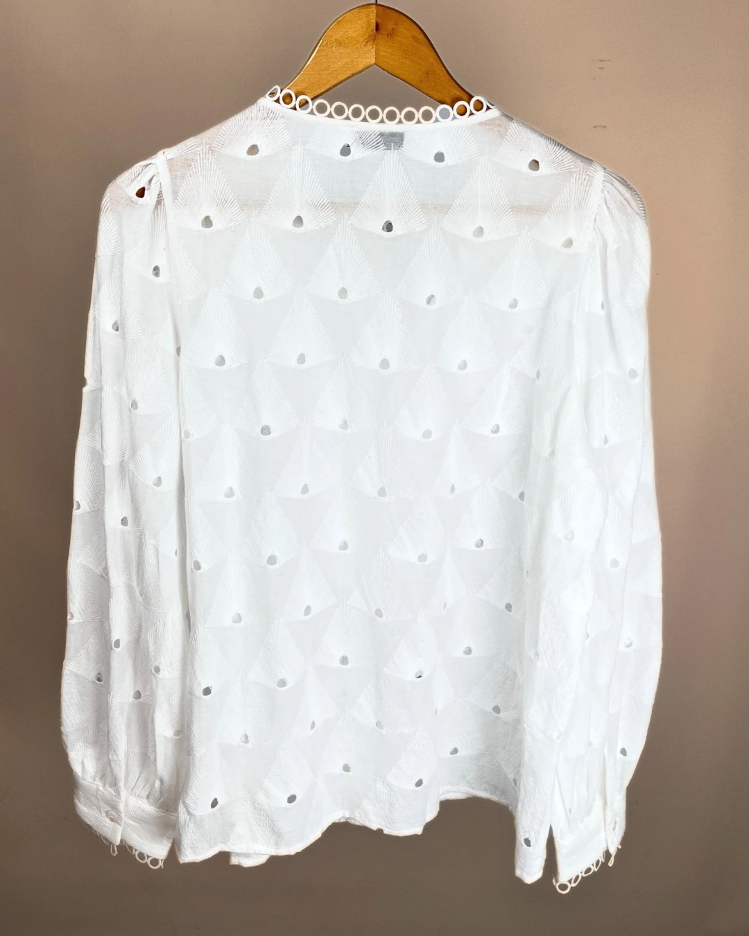 Camisa blanca con bordado en forma triangular, bordados florales que recorren toda la camisa, con agujeros circulares a lo largo de toda la camisa y círculos bordados en cuello y puños. Línea de encaje bordada desde hombros a mangas  que hacen que esta camisa sea diferente de una forma elegante y sencilla. Una camisa hecha para perdurar y tener de fondo de armario primaveral para siempre.