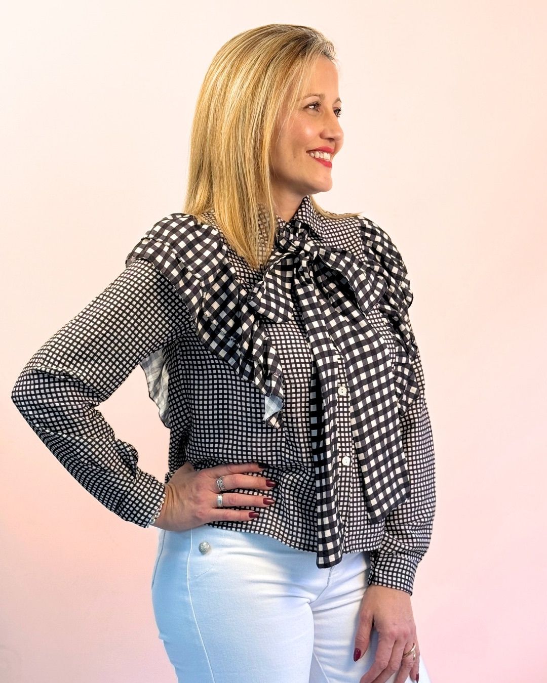 Camisa con flecos de media caída en hombro, con detalles en vichy en diferentes medidas y lazo a juego en cuadro vichy del mismo color, ideal para elevar tu look y hacerlo algo más especial y único. El lazo le proporciona mucha versatilidad a esta camisa, ya que lo puedes estilizar de diferentes formas.