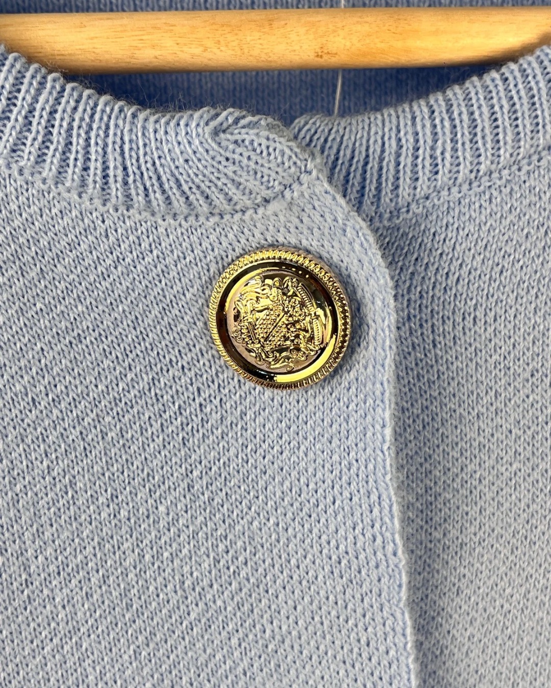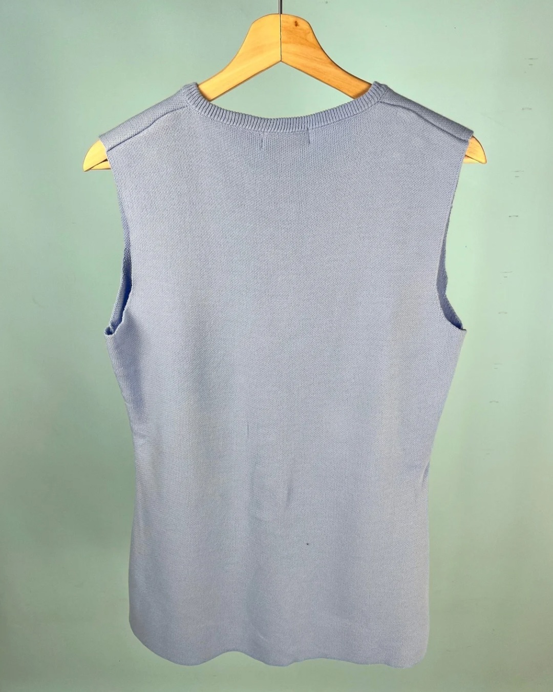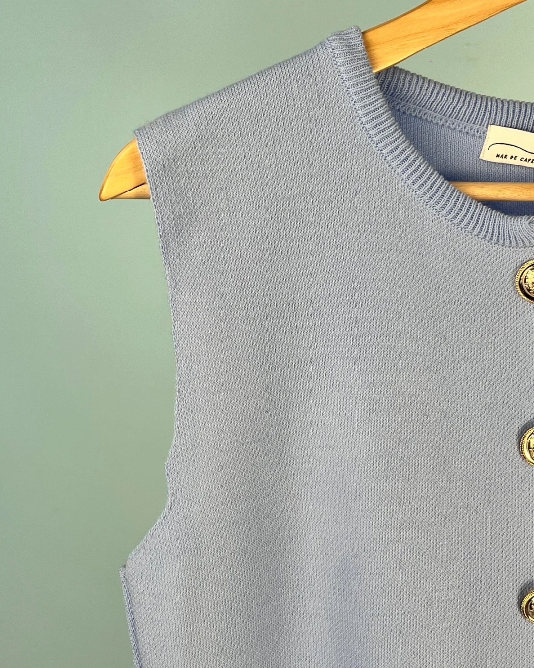 Chaleco azul de alta calidad textil, indispensable para elevar un look básico a algo más formal y elegante, gracias a la combinación de colores y detalles como los botones que cierran el chaleco. Versátil, recomendado para combinar con cualquier color pastel, o blancos.